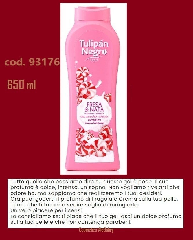 fragola e panna - Tutto quello che possiamo dire su questo gel è poco. Il suo profumo è dolce, intenso, un sogno; Non vogliamo rivelarti che odore ha, ma sappiamo che realizzeremo i tuoi desideri. Ora puoi goderti il profumo di Fragola e Crema sulla tua pelle. Tanto che ti faranno venire voglia di mangiarlo. Un vero piacere per i sensi. Lo consigliamo se: ti piace che il tuo gel lasci un dolce profumo sulla tua pelle e che non contenga parabeni.