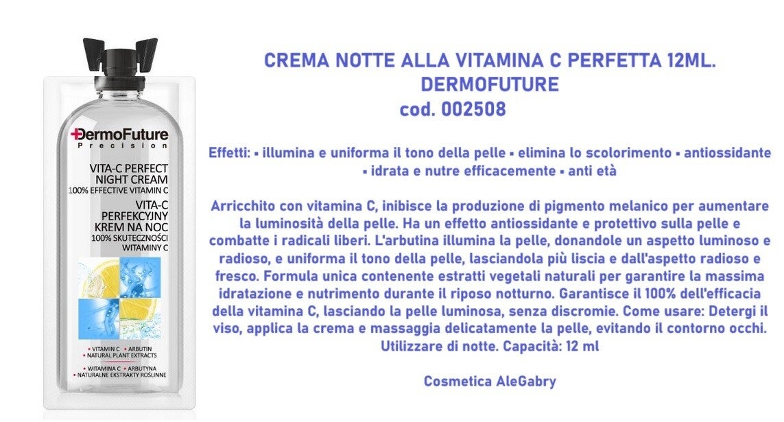 Arricchito con vitamina C, inibisce la produzione di pigmento melanico per aumentare la luminosità della pelle. Ha un effetto antiossidante e protettivo sulla pelle e combatte i radicali liberi. L'arbutina illumina la pelle, donandole un aspetto luminoso e radioso, e uniforma il tono della pelle, lasciandola più liscia e dall'aspetto radioso e fresco. Formula unica contenente estratti vegetali naturali per garantire la massima idratazione e nutrimento durante il riposo notturno. Garantisce il 100% dell'efficacia della vitamina C, lasciando la pelle luminosa, senza discromie. Come usare: Detergi il viso, applica la crema e massaggia delicatamente la pelle, evitando il contorno occhi. Utilizzare di notte. Capacità: 12 ml