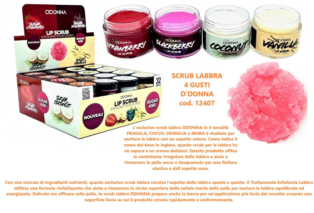 L'esclusivo scrub labbra DDONNA in 4 tonalità FRAGOLA, COCCO, VANIGLIA e MORA è studiato per esaltare le labbra con un aspetto setoso. Come indica il nome del tono in inglese, questo scrub per le labbra ha un sapore e un aroma deliziosi. Questo prodotto affina la consistenza irregolare delle labbra e aiuta a rimuovere la pelle secca o desquamata per una finitura elastica e dall'aspetto sano.