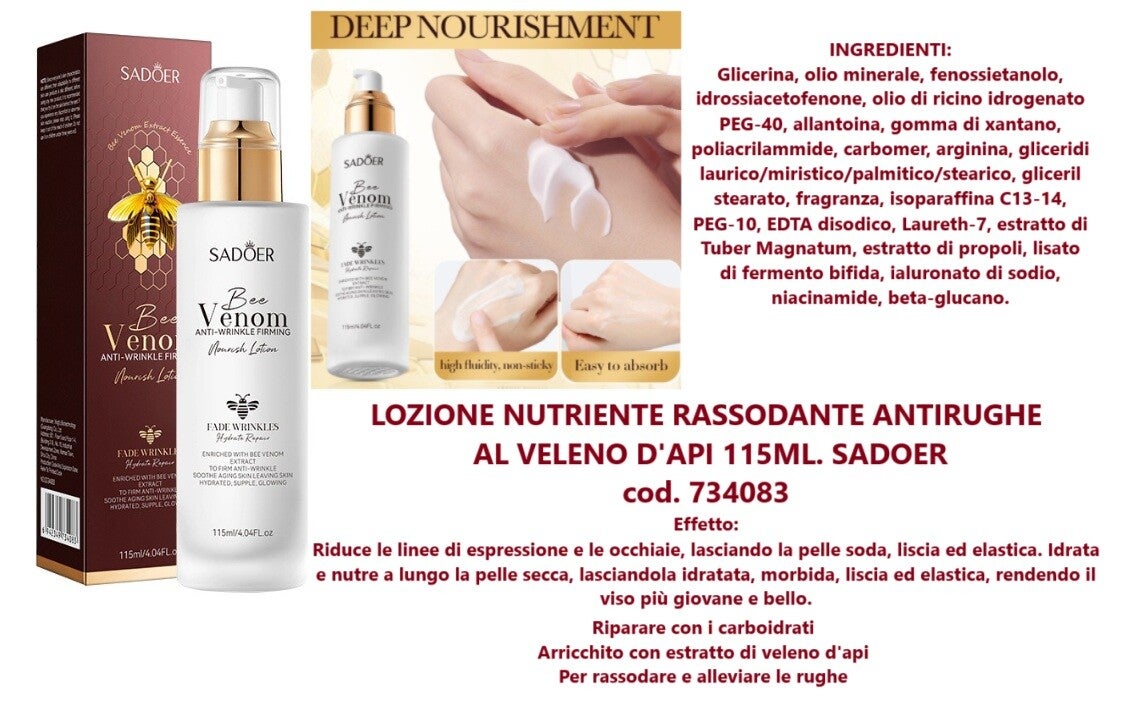 lozione nutriente - Effetto: Riduce le linee di espressione e le occhiaie, lasciando la pelle soda, liscia ed elastica. Idrata e nutre a lungo la pelle secca, lasciandola idratata, morbida, liscia ed elastica, rendendo il viso più giovane e bello. Riparare con i carboidrati. Arricchito con estratto di veleno d'api. Per rassodare e alleviare le rughe.