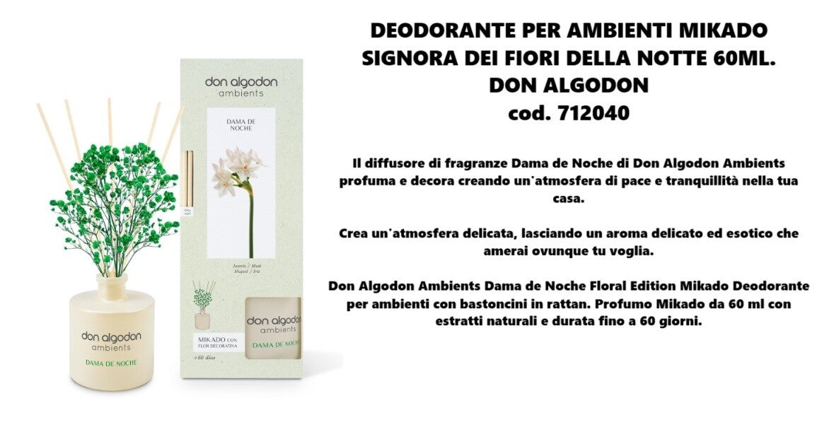 Don Algodon Ambients Dama de Noche Floral Edition Mikado Deodorante per ambienti con bastoncini in rattan. Profumo Mikado da 60 ml con estratti naturali e durata fino a 60 giorni.