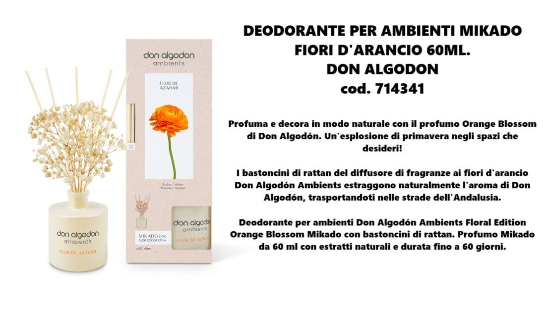 Deodorante per ambienti Don Algodón Ambients Floral Edition Orange Blossom Mikado con bastoncini di rattan. Profumo Mikado da 60 ml con estratti naturali e durata fino a 60 giorni.